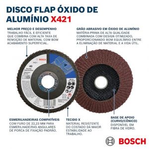 - O Disco Flap Bosch X421 Óxido de Aluminio é universalmente compatível com esmerilhadeiras.