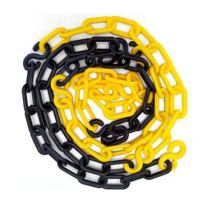 - Corrente plástica preta e amarela, não perdendo cor ou descascando, além de ser versátil, prática e resistente.