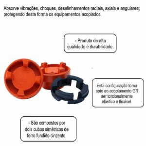 Os acoplamentos GR são compostos por dois cubos simétricos de ferro fundido cinzento, e um elemento elástico alojado entre eles, de borracha sintética de elevada resistência a abrasão. Absorvendo vibrações, choques, desalinhamentos radiais, axiais e angulares; protegendo desta forma os equipamentos acoplados. Estes acoplamentos permitem trabalho em posição horizontal e vertical, desde que corretamente fixados, e aceitam reversões de movimentos. Adquira já o seu!