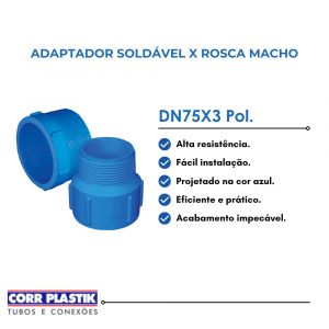O Adaptador Soldável x Rosca Macho DN75 x 3" da Corr Plastik é ideal para sistemas de irrigação. Fabricado com materiais de alta qualidade, garante durabilidade e fácil instalação, proporcionando conexões seguras e eficientes.