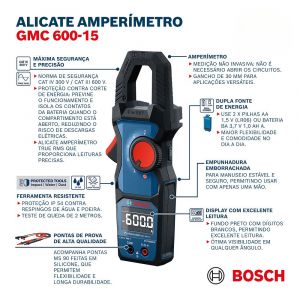 Meça corrente até 600 A AC com precisão True RMS, p Bosch GMC 600‑15 tem visor invertido, proteção IP54, detecção AC/DC, resistência, continuidade e muito mais. Robusto, seguro (CAT III/IV) e pronto para uso profissional.