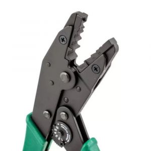 Alicate crimpador com botão de ajuste de pressão em 6 níveis, indicado para terminais RG (58, 59, 60), área de crimpar em aço Níquel-Cromo-Molibdênio, cabo em fibra de vidro e nylon, corpo em aço carbono.
