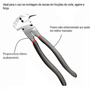 Oferece a você cliente mais eficiência, é multifuncional é ideal para esticar, torcer e cortar arame farpado ou arame de cerca elétrica, possui cabo emborrachado que ajuda em melhor manuseio.