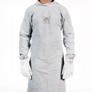 Avental com mangas do tipo barbeiro (soldador) com emendas é confeccionado em raspa de couro bovino curtido ao cromo, costurado com fio 100% algodão ou aramida. Possui tiras laterais em raspa, indicadas para fixação e ajuste do avental, com elásticos de ajustes no cano da manga, proporcionando segurança e facilidade de uso.