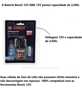 - A Bateria Bosch 12V GBA 12V possui capacidade de 2,0Ah.