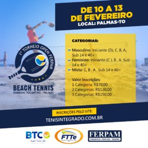 A Federação Tocantinense de Tênis e Beach Tennis, juntamente com a Ferpam, realiza entre os dias 10 a 13 de fevereiro o 1º Torneio Open Ferpam de Beach Tennis. O torneio será realizado no Beach Tennis Club (BTC), localizado na quadra 212 Sul, em Palmas.