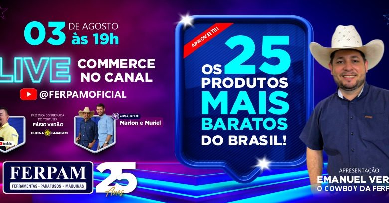 Para comemorar seus 25 anos, nesse dia 03 de Agosto, às 19h, a Ferpam realizará uma live commerce com os 25 produtos mais baratos do Brasil.