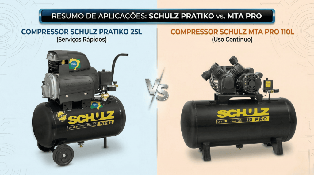 - Principal Diferença: O Pratiko possui apenas 1 cilindro e foco em portabilidade. O MTA Pro possui 2 cilindros (formato em V), entregando mais pressão (140 PSI) e volume de ar.