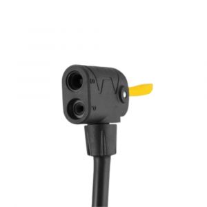 Possui corpo metálico e plataforma de apoio em plástico reforçado, mangueira plástica com 59 cm, válvula com bico duplo (Presta - fino e Schrader - grosso). Conta ainda com compartimento específico para armazenamento dos bicos.