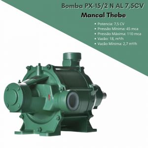 A Bomba PX-15/2 N AL 7,5CV Mancal Thebe é utilizada em irrigação, transferência de água para reservatórios, chácaras, abastecimento de bebedouros. Garanta já a sua!