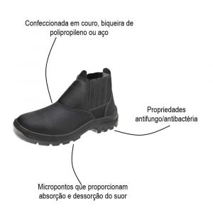 - Bota de segurança confeccionada em couro, biqueira de polipropileno ou aço.