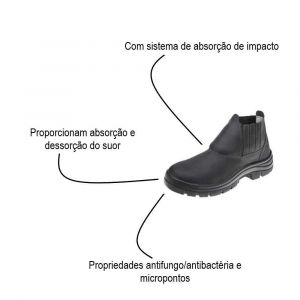 - Bota de segurança confeccionada em couro, biqueira de polipropileno ou aço.