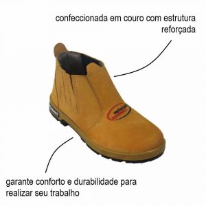 - Confeccionada em couro nobuck, palmilhas anti-stress, costura reforçadas e com fechamento com elástico lateral para melhor ajuste.