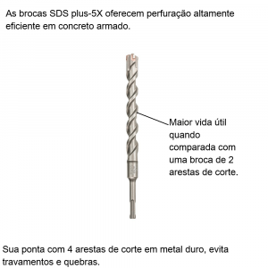 - As brocas SDS plus-5X oferecem perfuração altamente eficiente em concreto armado.