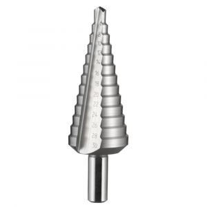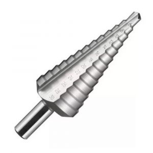 - Broca escalonada cônica é produzida em aço rápido HSS com acabamento brilhante.
