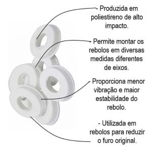 Acessório plástico que diminui o furo do rebolo permitindo sua montagem em um eixo de menor diâmetro. Produzida em poliestireno de alto impacto, permite montar os rebolos em diversas medidas diferentes de eixos. Proporciona menor vibração e maior estabilidade do rebolo.Não perca tempo e garanta já o seu!