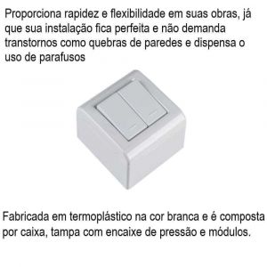 - Fabricada em termoplástico na cor branca e é composta por caixa, tampa com encaixe de pressão e módulos.