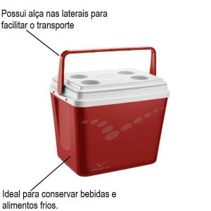 Oferece a você cliente mais praticidade, qualidade Perfeito para conservar bebidas e alimentos frios. Além disso, possui alça nas laterais para facilitar o transporte e tampa articulada com suporte para latas, copos ou garrafas.
