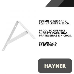 Conteúdo da Embalagem1 Peça de Cantoneira Mão Francesa Branca Ferro Leve 25cm Hayne.