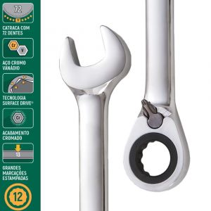 Chave Combinada Catraca Reversível SATA oferece ajustes rápidos com movimento contínuo, sem retirar da peça, possui 72 dentes, garantindo precisão e arco de 5º, muito superior aos 30º das chaves tradicionais, ideal para trabalhos ágeis e eficientes.