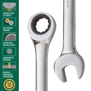 Chave duas em uma, possuí chave de boca de um lado e uma chave estrela com catraca do outro com tecnologia surface drive, para abraçar o parafuso ou a porca com mais segurança e facilitar pra você apertar ou desapertar eles sem muito esforço, mesmo em situações complicadas.