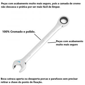 - Boca catraca aperta ou desaperta porcas e parafusos sem precisar retirar a chave do ponto de fixação.