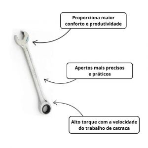 - Boca catraca aperta ou desaperta porcas e parafusos sem precisar retirar a chave do ponto de fixação.