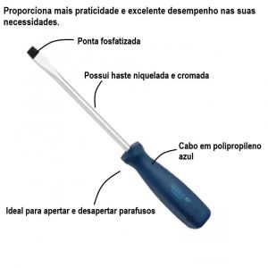- Oferece a você mais eficiência, e possui cabo é ergonômico, e a haste redonda e resistente, com perfil de encaixe para parafuso tipo fenda simples.