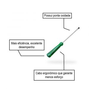 - Ideal para uso profissional pesado, seu cabo ergonômico rígido e resistente injetado em PVC na cor verde transparente deixa aparente a profundidade que a haste está.