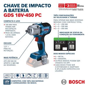 - A chave de impacto à bateria GDS 18V-450 PC da Bosch oferece desempenho excepcional em cada aplicação.