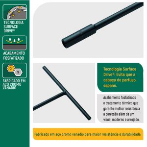 - O cabo em formato “T” permite aplicar mais força com menos esforço.