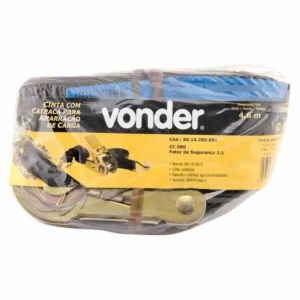 Cinta Catraca De Amarrações Para Carga 4.6x25 CC080 Vonder, proibido uso de alavanca no punho da catraca móvel, não utilizar para içamento de cargas, possui gancho tipo "J", catraca e gancho proporcionam boa resistência à oxidação.Indicado para amarração de cargas, proprio para distribuir as cargas e “amarrar” as paredes (internas com as externas). Garanta já a sua!