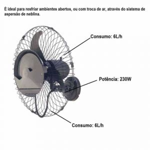- É ideal para resfriar ambientes abertos, ou com troca de ar, através do sistema de aspersão de neblina. As micropartículas de água evaporam, climatizando um ambiente de até 80m².