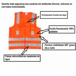 - Proporciona alta visibilidade e segurança confeccionado em tecido fluorescente com faixas retrorrefletivas.