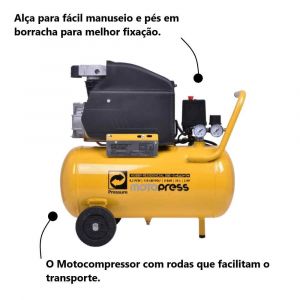 - Com pressão máxima de 116 psi e 24 litros de capacidade, o compressor portátil hobby motopress pressure é muito prático e eficiente, além de ser portátil!