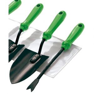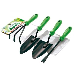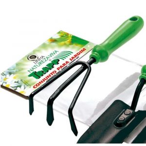 - Conjunto com 1 cultivador 3 pontas, 1 pá estreita, 1 pá larga e 1 extrator de ervas
