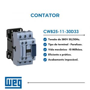 O Contator WEG CWB25-11-30D33 (8,7cv, 40A, 380V, 50/60Hz) é ideal para comandos elétricos industriais. Oferece alta performance e confiabilidade em suas operações. Excelente escolha para controlar motores elétricos com segurança.