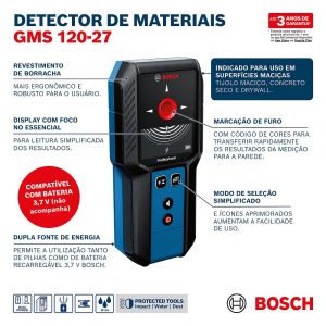 - O detector de materiais Bosch GMS 120-27 foi desenvolvido para atender com precisão a detecção de metais, fios energizados e madeiramento principalmente em Drywall, com ele é possível detectar metais ferrosos a até 12 cm de profundidade, aqueles atraídos por ímãs, como o aço, ferro fundido ou laminado, dentre outros.