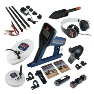 - 1 detector Gold Monster, 1 Bobina DD de 10x6 polegadas, 1 Bobina DD de 5 polegadas, 1 par de fones de ouvido Minelab, 1 pazinha de escavação Minelab, 1 adaptador de haste para bobina, 1 bateria de íon de lítio recarregável, 1 suporte para pilhas AA, 1 cabo carregador acoplável para bateria de carro, 1 conjunto de hastes, 1 guia de introdução ao produto.