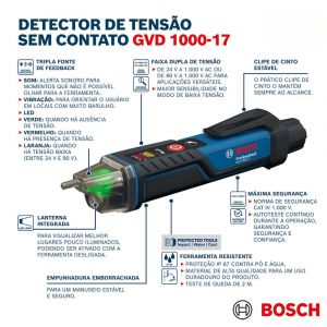 Detector de Tensão Bosch GVD 1000‑17 detecta tensões AC de 24 a 1000 V sem contato, com alertas por luz, som e vibração, resistente (IP67), compacto, com lanterna e autoteste.