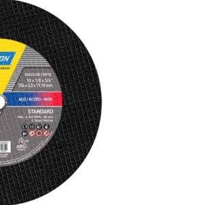 - Com 10 polegadas de diâmetro, espessura de 1/8" e furo de 3/4", este disco da linha Standard é indicado para operações em máquinas estacionárias, como serra de corte e policorte.