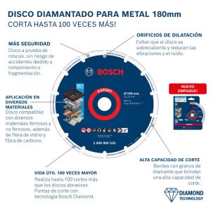- O Disco Diamantado Bosch para Metal 180mm possui o mais alto rendimento da categoria com capacidade de corte de até 100x mais do que discos abrasivos convencionais no corte de metais.