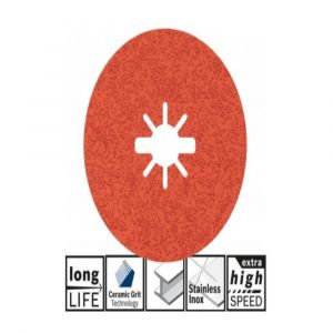 O disco de lixa de fibra Bosch remove o material até 40% mais rápido em comparação com os discos de lixa de fibra padrão. A forma triangular otimizada do grão prisma technology permite um corte limpo e rápido em metal e aço inox. Assim, consegue-se um desbaste de material até 80% mais rápido em comparação com os discos de fibra cerâmicos com grão partido. A estrutura especial do grão moldado garante um efeito de autoafiamento, obtendo-se um resultado de lixamento uniforme.