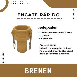 Conteúdo da Embalagem1 Acoplador Engate Rápido Fêmea x Espigão 3/4" Nylon Bremen.