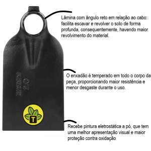 - O enxadão é temperado em todo o corpo da peça, proporcionando maior resistência e menor desgaste durante o uso.