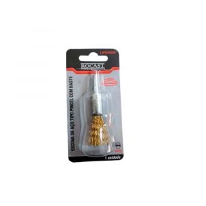 Escova de aço latonado tipo pincel com haste 5/8 pol. Rocast, ideal para limpeza, desbaste leve e acabamento em superfícies metálicas, garantindo eficiência e durabilidade.