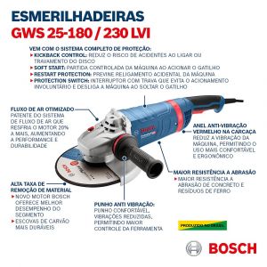 - A esmerilhadeira angular Bosch GWS 25-180 LVI VULCANO vem com todos as funcionalidades de segurança: kick back stop, capa de proteção, restart protection, soft start e gatilho deadman, além de possuir sistema "turbo" de resfriamento.
