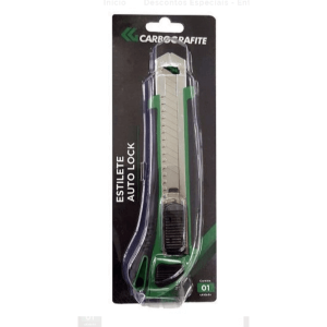 Estilete Auto Lock Carbografite 012473112 - Possui corpo em material plástico com revestimento em borracha, oferecendo segurança e firmeza durante o uso, conta com trava automática e deslizante, lâmina feita em aço resistente, permitindo maior durabilidade, compartimento para lâminas extras. Para cortes nos mais diversos serviços, cortes em papel, papelão, tecidos, plásticos, materiais sintéticos, entre outros.