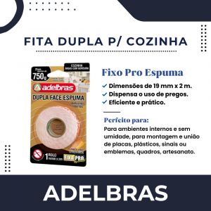 Conteúdo da Embalagem1 Unidade de Fita Dupla Face Espuma Fixa Pro Cozinha 19mmX2m Adelbras.