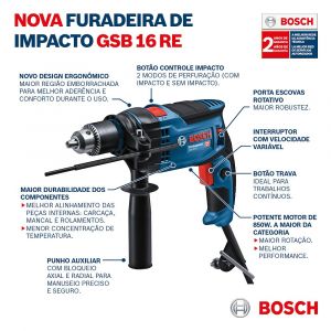- A furadeira de impacto Bosch GSB 16 RE é indicada para os trabalhos mais exigentes. É a primeira furadeira da categoria com 850W de potência e rotação de 3.500 RPM, por isso, traz a combinação perfeita de robustez e desempenho.